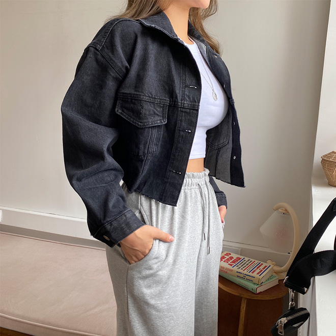 짧은 크롭기장으로 캐주얼하게 착용되는 청자켓이에요